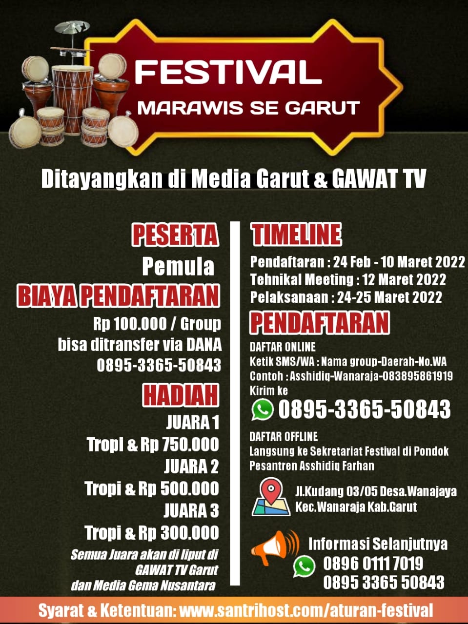 • Perwakilan dari setiap tim mendaftar langsung ke Pondok Pesantren Asshidiq Farhan Kudang Wanaraja.